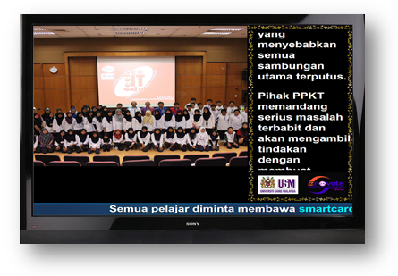 Sistem hebahan elektronik secara atas talian (online), pentadbir boleh memasukkan pengumuman dalam bentuk text, gambar atau video. Paparan akan ditukar secara automatik sebaik sahaja pengumuman dikemaskini atau ditambah. |