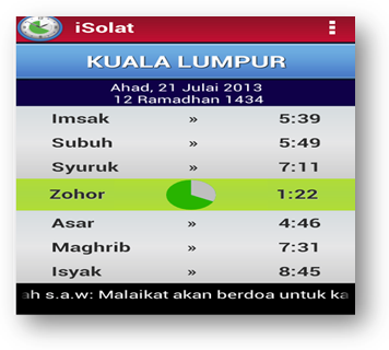 Sebuah aplikasi informasi waktu solat khusus untuk telefon pintar jenis Android, ianya dapat memaparkan waktu solat bagi seluruh bandar-bandar utama di Malaysia disamping dapat mengingatkan anda apabila tiba masuk waktu solat. |