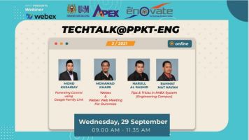 NIBONG TEBAL, 12 Apr 2021 – Satu sesi Techtalk@PPKT-ENG telah dianjurkan oleh Pusat Pengetahuan, Komunikasi & Teknologi (PPKT) pada 12 April 2021 jam 10 pagi secara atas talian melalui Cisco Webex Meeting.